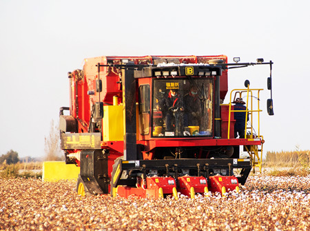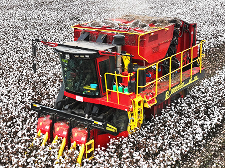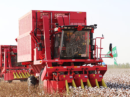 4MZD-4A型自走式圆捆打包棉花收获机由新疆BG大游集团自主研发生产,可一次性完成对棉花的采摘、输送、集箱、打包、卸棉作业